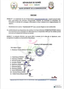 À travers une décision en date de ce samedi 6 septembre 2025, le site d’informations Guineematin.com et sa téléweb viennent d’être suspendus par la Haute Autorité de la Communication jusqu’à nouvel ordre.